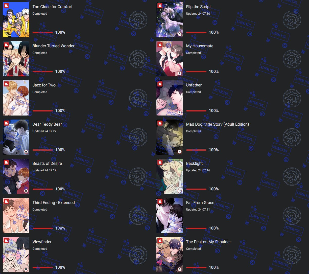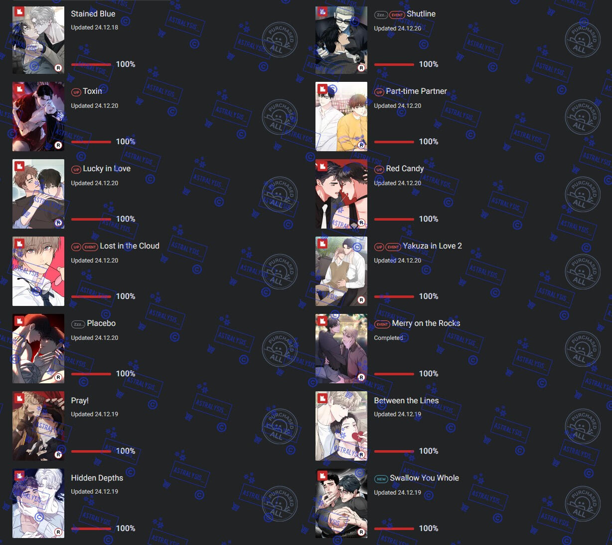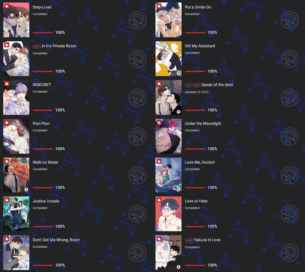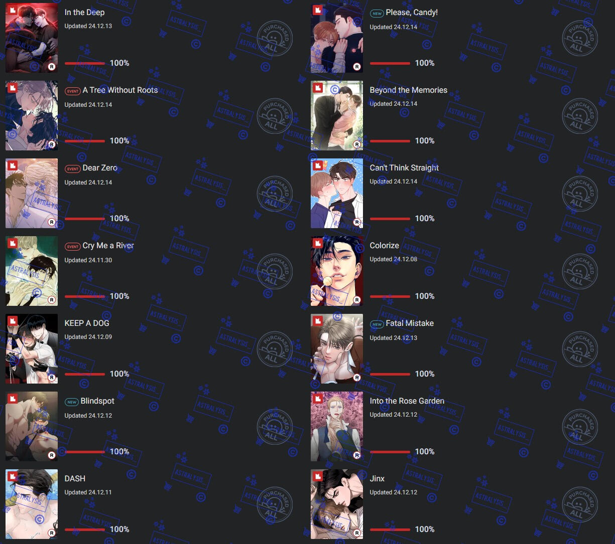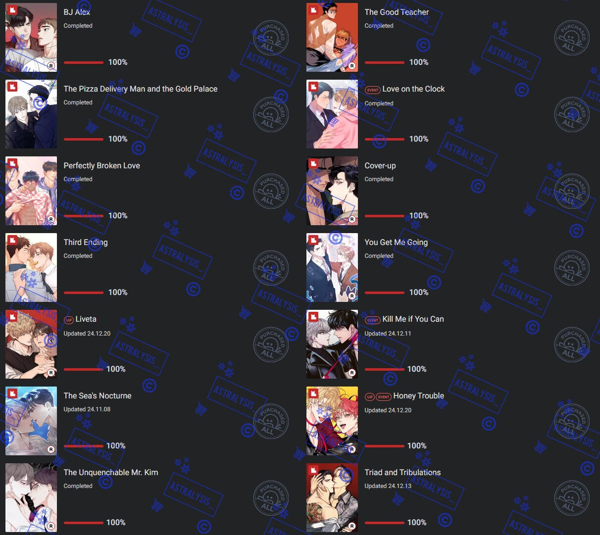 | LOTS of BL manhwa, chicken, romance, angst, chicken, honkai series, genshin, overwatch, fruity things, cherry tomatoes, chicken, twice, mangoes |