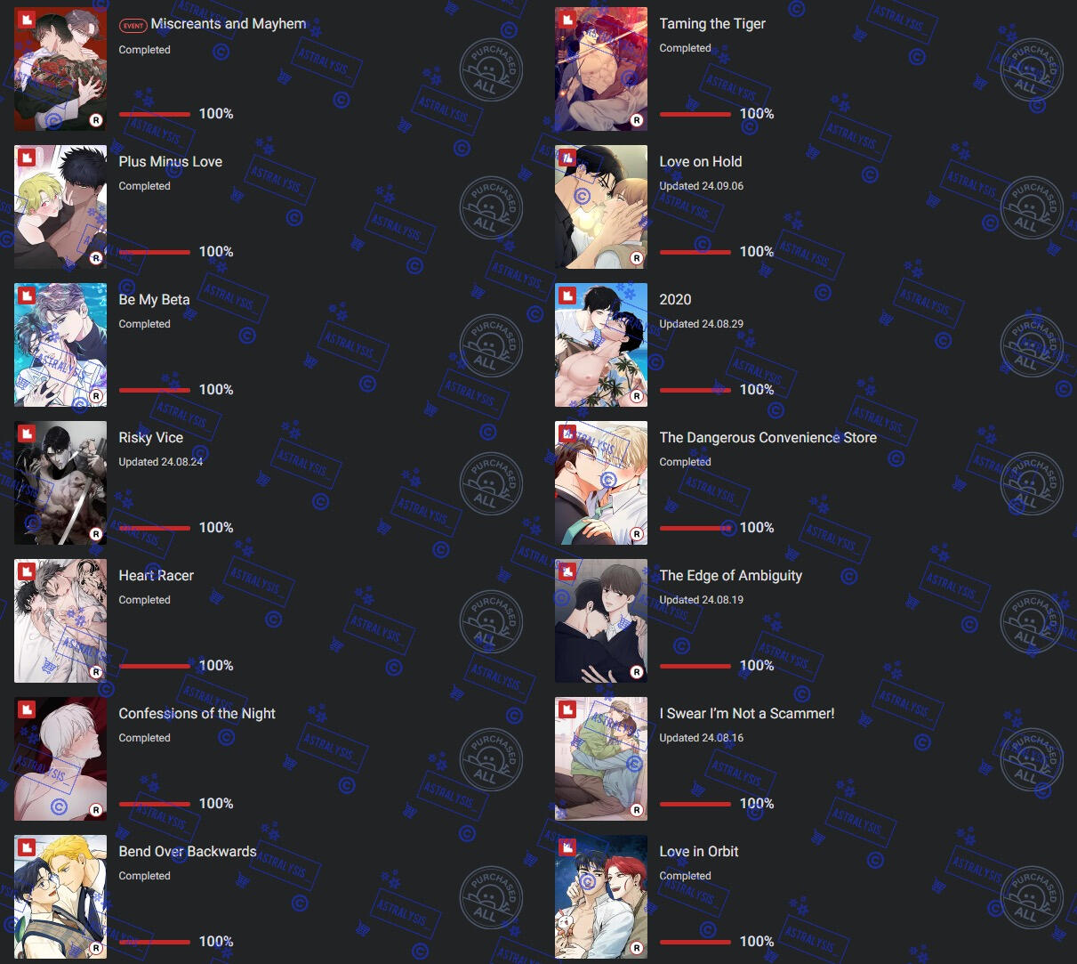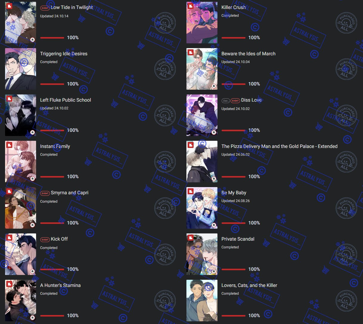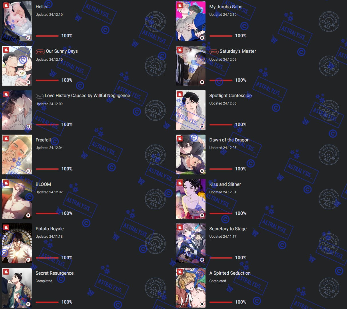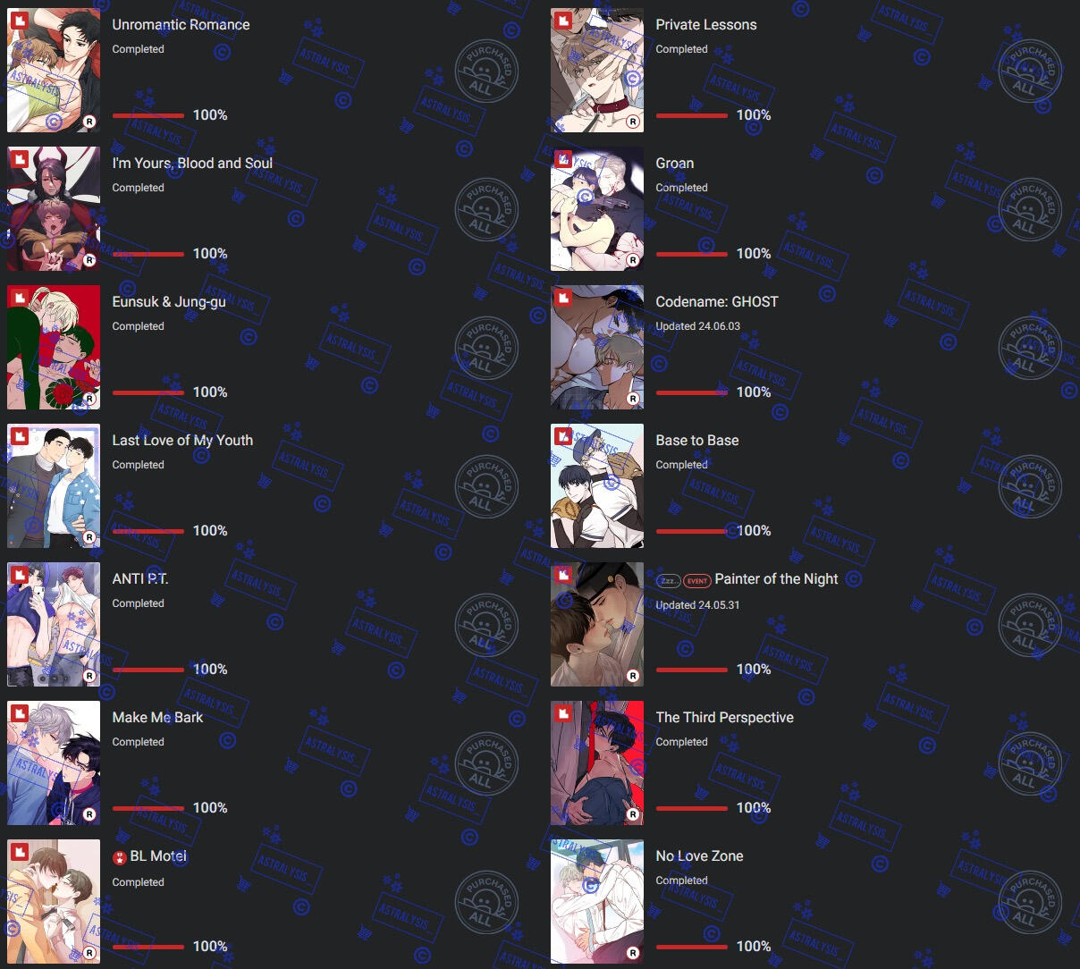 | LOTS of BL manhwa, chicken, romance, angst, chicken, honkai series, genshin, overwatch, fruity things, cherry tomatoes, chicken, twice, mangoes |